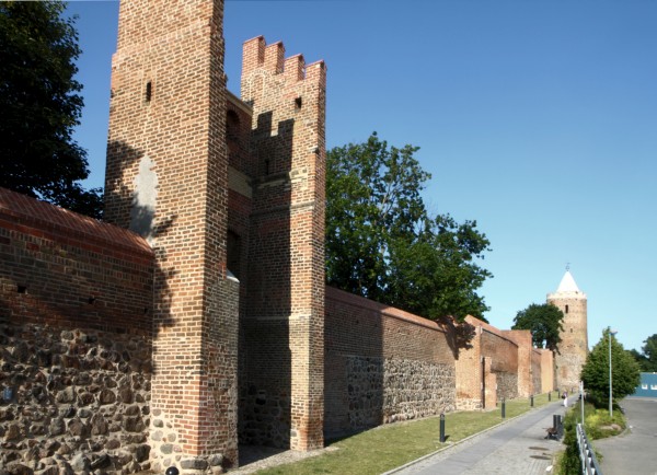 Blick entlang der Stadtmauer mit Wiekhäusern an der Dr.-Wilhelm-Külz-Straße zum Blindower Torturm
