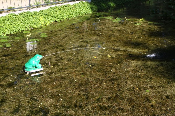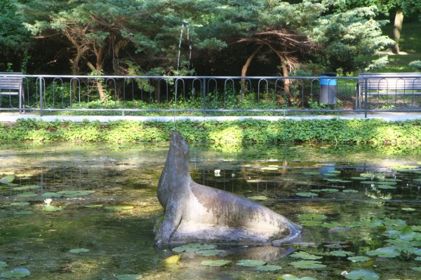 Goldfischteich im Stadtpark, Frosch und Seehund mit Fontänen |