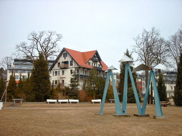 Blick über den Erich-Weinert-Platz mit Windspielen zum Hotel Esplanade
