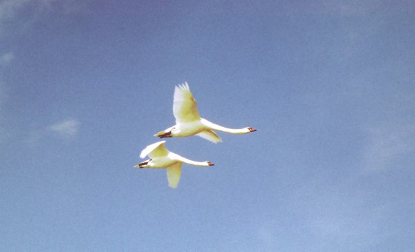 Schwäne im Flug über den Scharmützelsee von der Seebrücke in Bad Saarow-Pieskow (Ausschnitt vom Dia).