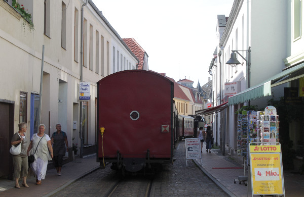 Die "Mecklenburgische Bäderbahn Molli" (Schmalspurbahn) in der Mollistraße auf Höhe Querstraße
