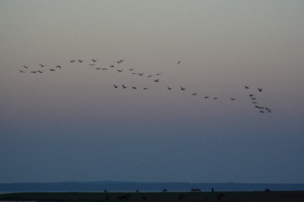 Kraniche über dem Schweriner Werder kreisend, Blick nach Osten Richtung Müritz Nationalpark
