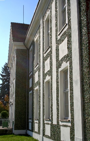 Fassade von Schloß Rumpshagen, ein Barockschloß von 1730-32, im Streiflicht. Die Fassade ist eine Besonderheit. Von der Glashütte des Eigners wurde Glasbruchstücke in den Putz gedrückt, so daß die Farbgestaltung der Fassade von den Glasstückchen herrührt. |