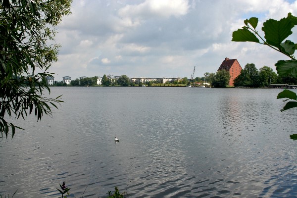 Blick über den Schweriner See von der Knaudtstraße aus nach Nordost zu den Stadvillen an der Möwenburgstraße und dem Gewerbegebiet an der Hafenstraße / Speicherstraße