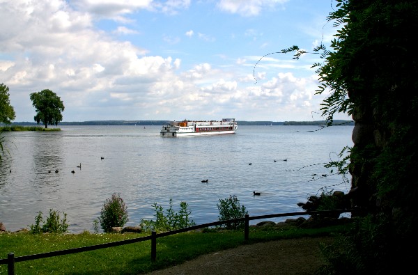 Schweriner See vom Burggarten aus auf Höhe der Grotte mit Fahrgastschiff
