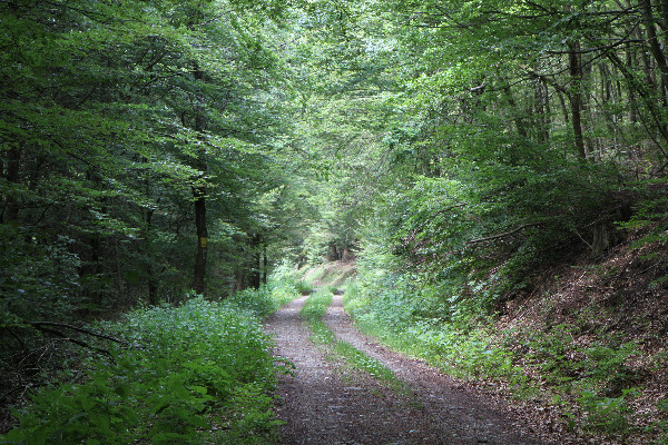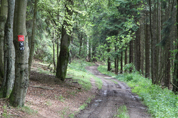 Blick über den Weg zur Ruhrquelle (Rothaarsteig) im Wald südlich des Ruhrkopfes