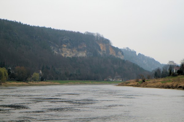 Blick von der Elbfähre stromaufwärts über die Elbe, im Hintergrund rechts die Bastei