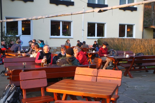 Ziel des Bergtestes bei der Pension am Nationalpark, Bergtestwanderer bei der Stärkung danach