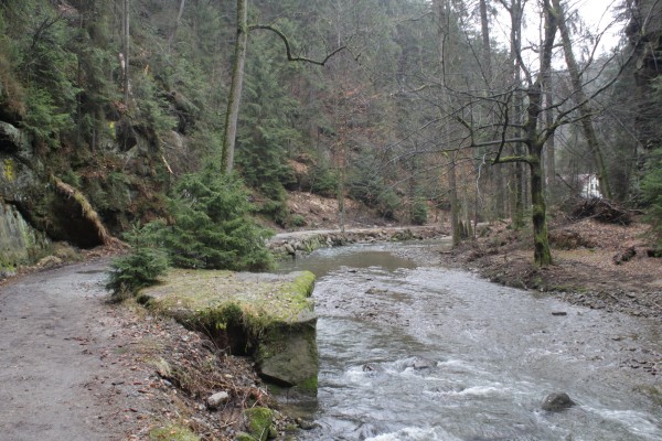 Blick durchs Polenztal mit Wanderweg und der Polenz, im HIntergrund das Gasthaus Polenztal