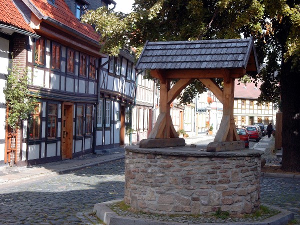 Alter Brunnen im Heideviertel (Brunnenschacht über 500 Jahre alt). 1998 bei Straßenbauarbeiten ejtdeckt, 1999 mit Haube rekonstruiert. Blick in die Hinterstraße nach Osten