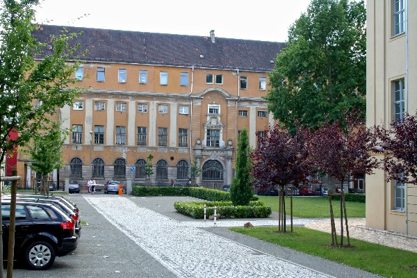 Blick von der Humboldtstraße aus auf die Gebäudefront des Fernmeldeamtes an der Amthorstraße