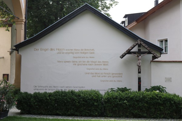 Anbetungskapelle westlich des Basilika, Der Engel des Herrn brachte Maria die Botschaft, Gegrüßet seist du, Maria. Maria sprach: Siehe, ich bin die Magd des Herrn; Gegrüßet seist du, Maria. Und das Wort ist Fleisch geworden Gegrüßet seist du, Maria. |