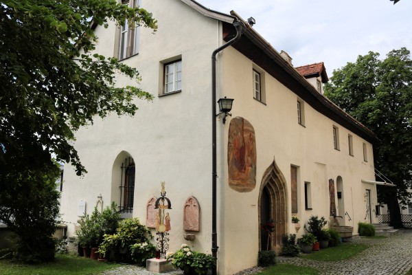Mesnerhaus (ehemalige Totenkapelle), mit Fassadenmalerei und Kielbogenportal