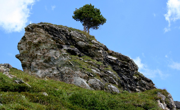 Felsen mit Baum am westlichen Aufstieg zum Torjoch