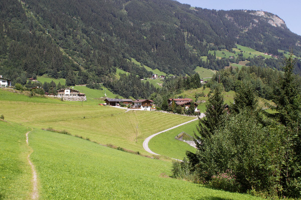 Blick vom Fuß des Gamsberges über den Weg nach Finkenberg-Dornau zur Geschößwand im Hintergrund