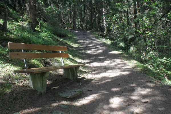 Weg im Wald des Gamsberges nach Jochberg mit Bank