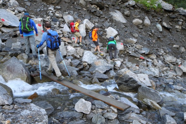 Bachbett unterhalb des Einstiegs zur Mörchnerscharte (Murenbett) mit Bohlenbrücke und Steinbockmarschierern