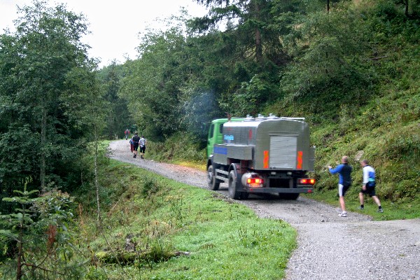 Wie jedes Jahr, begegnet den Steinbockmarschierern der Milchwagen, der die Almen im Floitengrund abfährt und die Milch abholt.