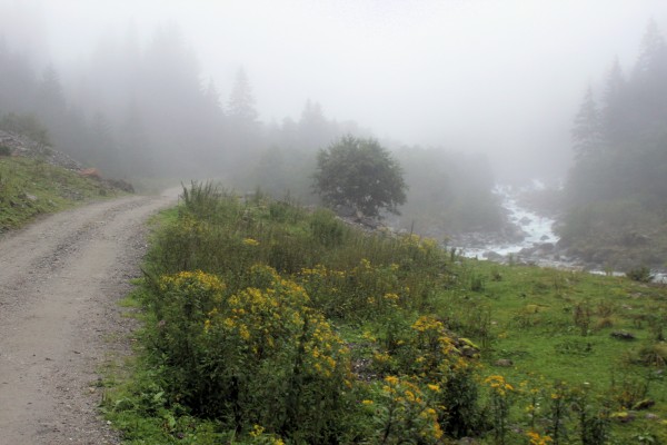 Floitengrund im Nebel oberhalb der Sulzenalm, Blick bergwärts auf den Floitenbach