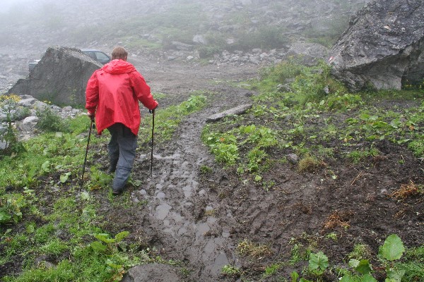 Wegpartie im Floitengrund im Matsch beim Ende des Fahrweges