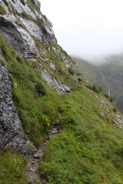 Aufstieg zur Mörchnerscharte, Weg entlang des Steilhanges mit Blick zur Lapenscharte im Nebel