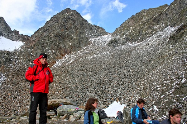 Blick zur Mörchenscharte von der Karstufe, ein beliebter Rastplatz vor dem letzten Anstieg, auch hier steht immer ein Streckenposten der Bergwacht