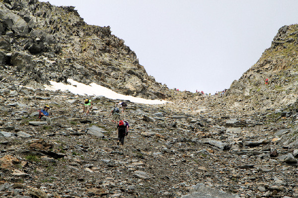 Aufstieg zur Mörchnerscharte, Blick über das Blockwerk hinauf zur Scharte |