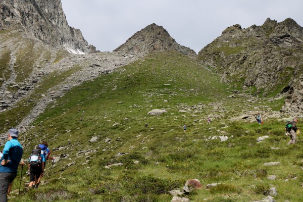 Aufstieg zu Mörchnerscharte im mittleren Abschnitt, im Hintergrund die südliche und nördliche Mörchnerscharte