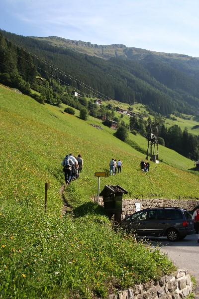 Blick die Bergmähderwiese empor mit dem Bergmähderweg über die Bushaltestelle beim Gasthof Thanner