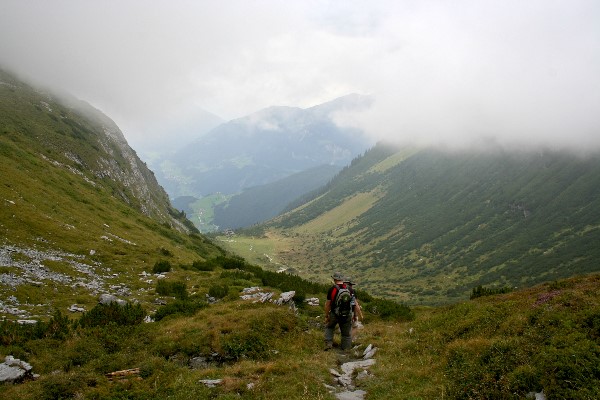 Blick durchs Brandberger Kar nach Westen Richtung Tuxer Tal, der Hochfeld in Wolken, unten im Brandberger Kar das Kolhaus