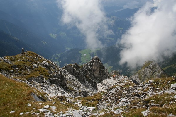 Blick vom Weg am Brandberger Kolm beim Abstieg über den Kolmgrat auf den Kleinen Kolm und Brandberg im Zillergrund mit aufkommenden Wolken