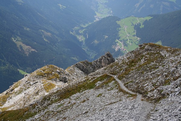 Abstieg vom Brandberger Kolm auf der Südseite, Blick über den Steig und Grat des Kolms in den Zillergrund und auf Brandberg