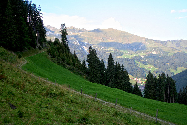 Blick über die Wiesen der Brandalm nach Osten zur Wanglspitze