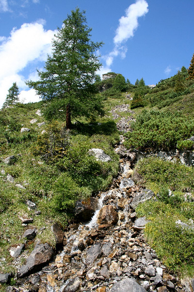 Hang des Junsberg mit Bach und Fichte unterhalb der Stoankasern