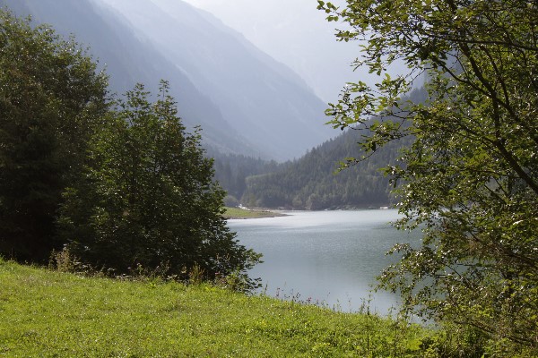 Blick durch den Stillupgrund über den Speicher Stillup vom Ostende des Tunnels beim Wasserfallhaus (unterhalb des Toreggenkogels)