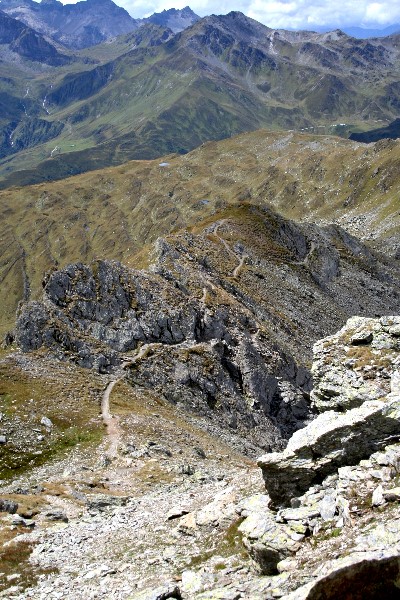 Blick über den Westgrat des Rastkogels nach Westen in Richtung Nurpensjoch und Lämmerbichlalm