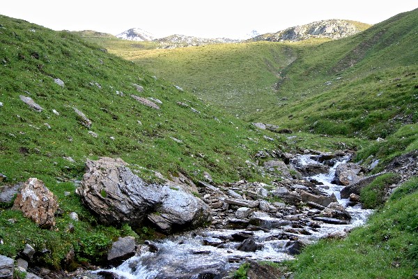 Blick zum Talschluß des Weitentals mit dem Tuxerjoch über den Weitentalbach