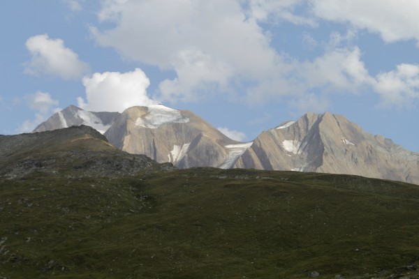 Blick vom Weg 528 im Tal des Zamser Baches zur Hochfeilergruppe im Osten mit Hochfeiler, Hochferner und Weißspitze