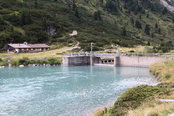 Blick über den Zemmbach am Wehr hinüber zur Waxeggalm, der Zemmbach wird hier zum Schlegeis-Stausee abgeleitet.