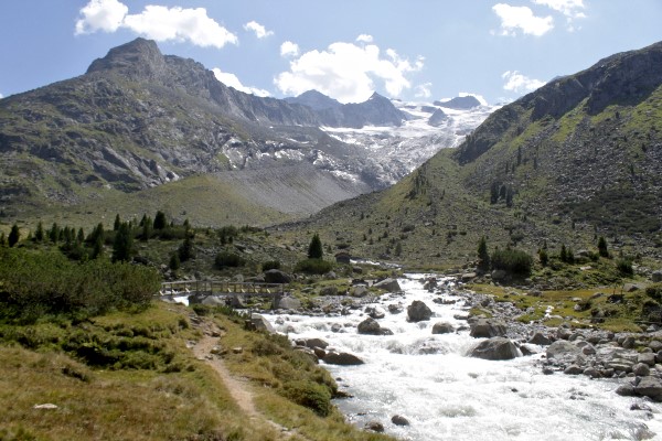 Blick über den Zemmbach bergwärts aus Höhe der Alpenrose-Hütte, links der Steinmandl (2634 m), rechts das Waxeggkees mit dem Großen Möseler (3480 m)