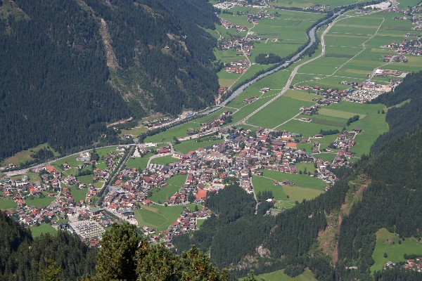Blick auf Mayrhofen aus Höhe der Bergstation der Ahornbahn auf dem Ahornplateau