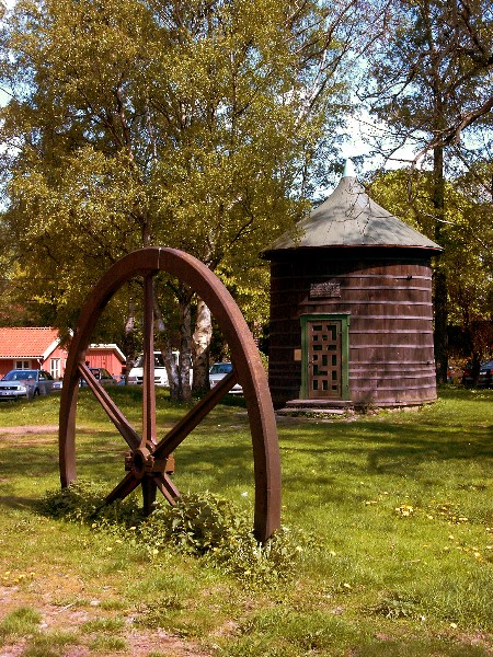 Kulturreservat Klippan, Bebauungsensemble um die Gamla Älvsborg slottsruin herum, hier zum Häuschen hergerichtetes Riesenfaß