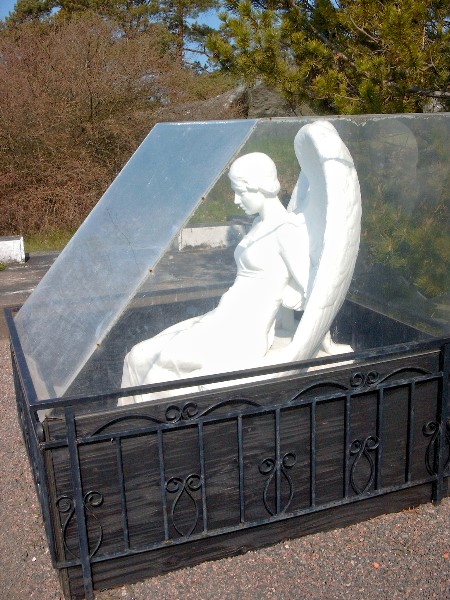 Marmorengel im Schloßpark von Schloß Tjolöholms. Frau Blanche Dickson ließ hier 1903 ein Mausoleum in weißen Marmor errichten. Das Dach stürzte 1973 ein und der Marmor wurde verwertet. Der Engel gehörte offenbar zur Ausstattung des Mausoleums.